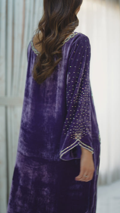 Unleash your inner icon in this Deep Purple Kaftan that thrives on attention. Luxurious French velvet forms the foundation of this show stopping piece, while intricate hand-applied silver stones and crystals create an electrifying shimmer. The deep purple canvas amplifies every sparkle, ensuring you command the room with magnetic presence. For the fearless fashionista who refuses to fade into the background, this kaftan is your ultimate power move. Wear it boldly and redefine what elegance means on your own terms. Fabric Kaftan French Velvet