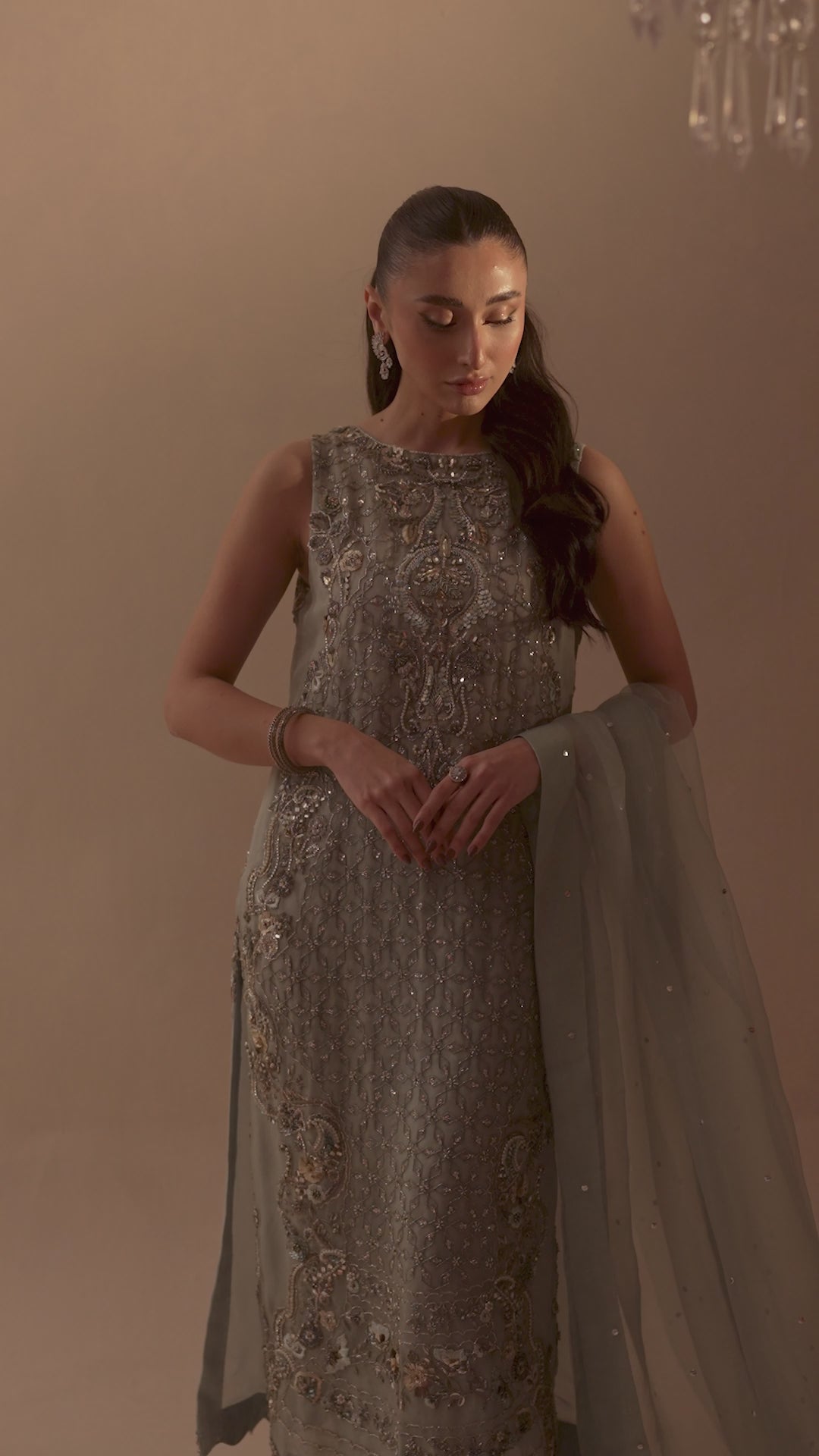 Giselle Ice blue redefines bespoke luxury. The shirt front and back is adorned with intricate stones, katdana, dabka, sequence, and resham jaal, complemented by delicate dabka booties and hand-etched kora and naqshi work. Paired with an ornate sprayed pure organza dupatta and sleek straight pants, this ensemble is crafted with meticulous attention to detail, making it a subliminal addition to your festive wardrobe.