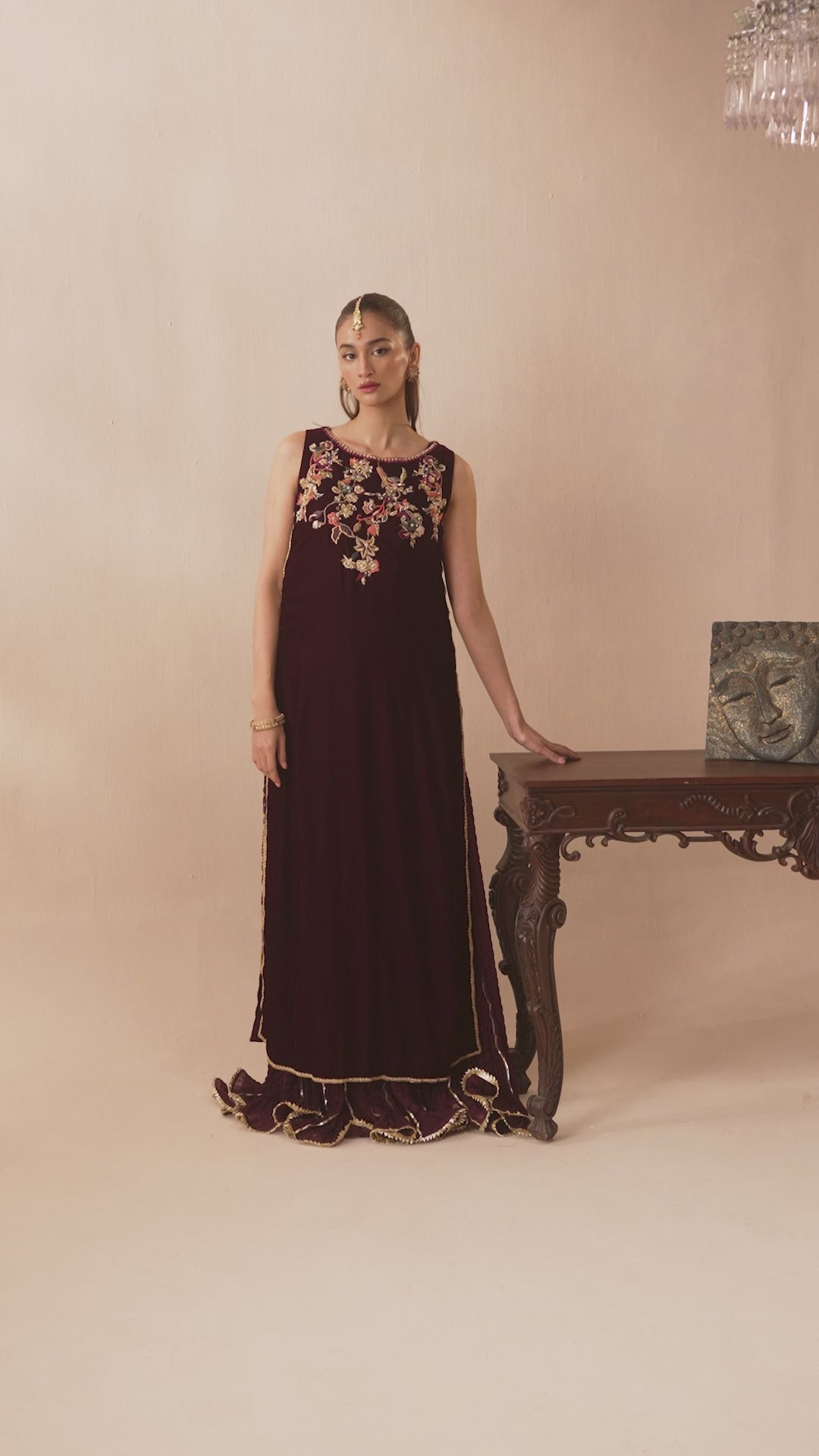 Rita Crimson is a deep maroon velvet ensemble designed for grandeur. The shirt, highlighted with chattapatti edges with tassels, features intricate resham, dabka, and gotta work on the front, back, and sleeves. Paired with a swirly lehenga and a pure organza dupatta.
